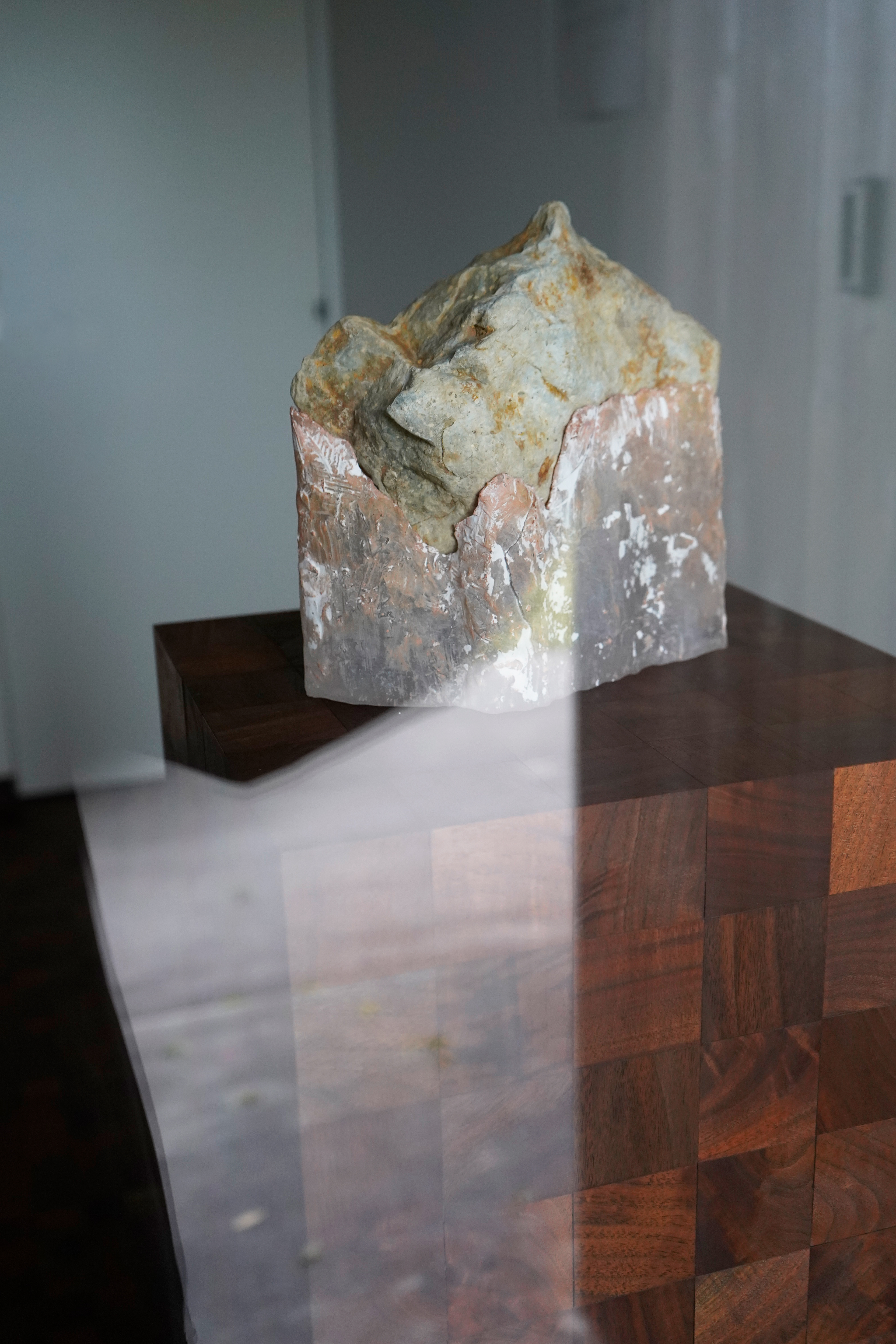 The base of the stone is molded, and molten glass is poured into the mold to support the stone. For glass to support the stone, and for the stone to support the glass, their origins and destinies remain unknown. Yet, these two disparate materials come together to create a single landscape.